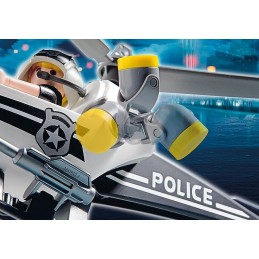 Hélicoptère avec un pilote équipé. Les hélices de l'hélicoptère tournent. Les projecteurs sont orientables. Allo commissariat, cambriolage repéré... Intervention immédiate ! Hélicoptère avec un pilote équipé. Les hélices de l'hélicoptère tournent. Les projecteurs sont orientables.