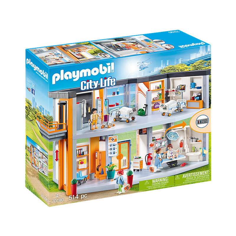 La salle d'opération est équipée d'un écran de contrôle lumineux (nécessite 1 pile AAA de 1,5 V non fournie), d'un projecteur qui pivote et de nombreux autres dispositifs de soin. L'ascenseur transporte les personnages à l'étage supérieur où se trouvent les chambres et une salle de bain. Avec trois personnages et de nombreux accessoires. Dimensions : 70 x 31 x 34 cm (LxPxH).