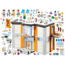 Accessoires: 1 bâtiment hospitalier avec ascenseur, 1 lampe OU pivotante, 1 moniteur, 1 conteneur mobile, 1 table de soins, 1 moniteur de surveillance, 1 support de perfusion mobile, 2 perfusions avec tube, 1 accès à la perfusion, 1 protège-dents, 2 mallettes médicales, 1 jeu de couverts OU, 1 stéthoscope, 1 marteau réflexe, 1 microscope, 1 portoir pour tubes à essai, 3 petits tubes à vis, 2 grands tubes à vis, 1 tube de pommade, 1 presse-papiers, 2 images radiographiques, 2 fentes pour moniteur éclairé, 2 informations patient, 1 feuille d'autocollants avec des étiquettes en plâtre et bandage, 2 lits d'hôpital, 1 téléviseur patient, 1 lavabo, 1 lavabo avec toilettes, 2 béquilles, 1 serviette, 3 flacons cosmét...