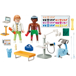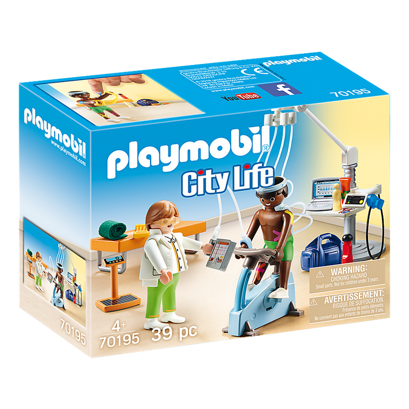 Le kinésithérapeute peut remettre tout le monde sur pieds. Aujourd'hui, un patient est venu faire des exercices pour sa séance habituelle sur le vélo du kiné. Le cabinet de kinésithérapeute Playmobil City Life 70195 comprend un appareil pour mesurer les performances du patient sur le vélo stationnaire, des autocollants de couleur et de nombreux accessoires.
