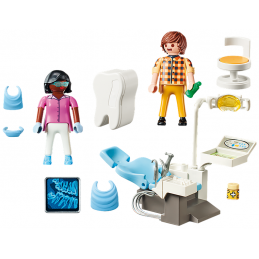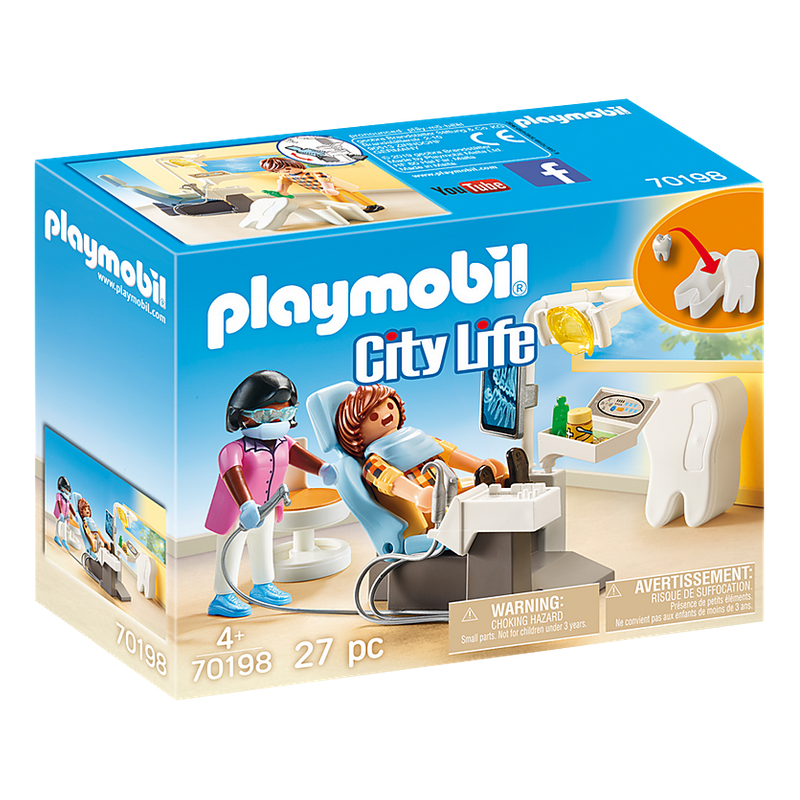 Le dentiste effectue un traitement dentaire sur le patient avec son équipement spécialisé. Il fait une radio pour voir s'il n'y a pas de caries. Le patient n'est pas très rassuré car il a peur d'avoir mal. Mais le dentiste est doux et fait attention. L'expression du visage du patient change en tournant la tête : sa bouche s'ouvre. Dentiste Playmobil City Life 70198 comprend une boîte de rangement pour les dents de lait.