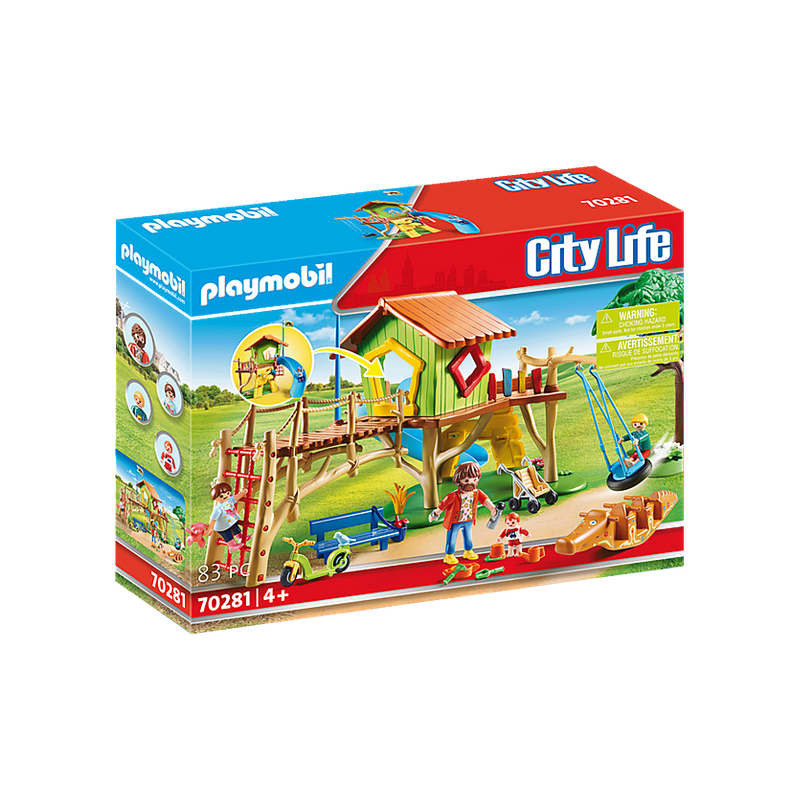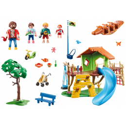 L'accès à la cabane de jeu se fait par un filet d'escalade ou un mur avec prises. Parc de jeux et enfants Playmobil City Life 70281 comprend un toboggan. Avec balançoire en forme de pneu et balançoire crocodile ainsi que des jouets pour le sable