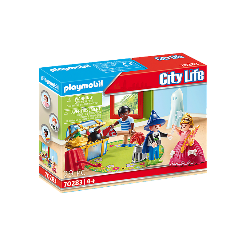 Le coffret Enfants et malle de déguisements Playmobil City Life 70283 contient les accessoires pour permettre de déguiser les enfants en chevalier, en magicien, en princesse, en diable, en fantôme et en fée des fleurs. Les accessoires inclus peuvent être portés par tous les personnages. Les petites pièces peuvent être rangées dans le coffre au trésor.