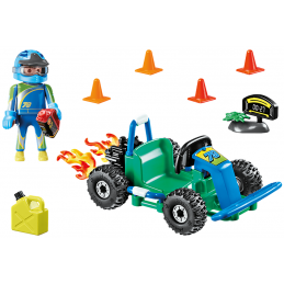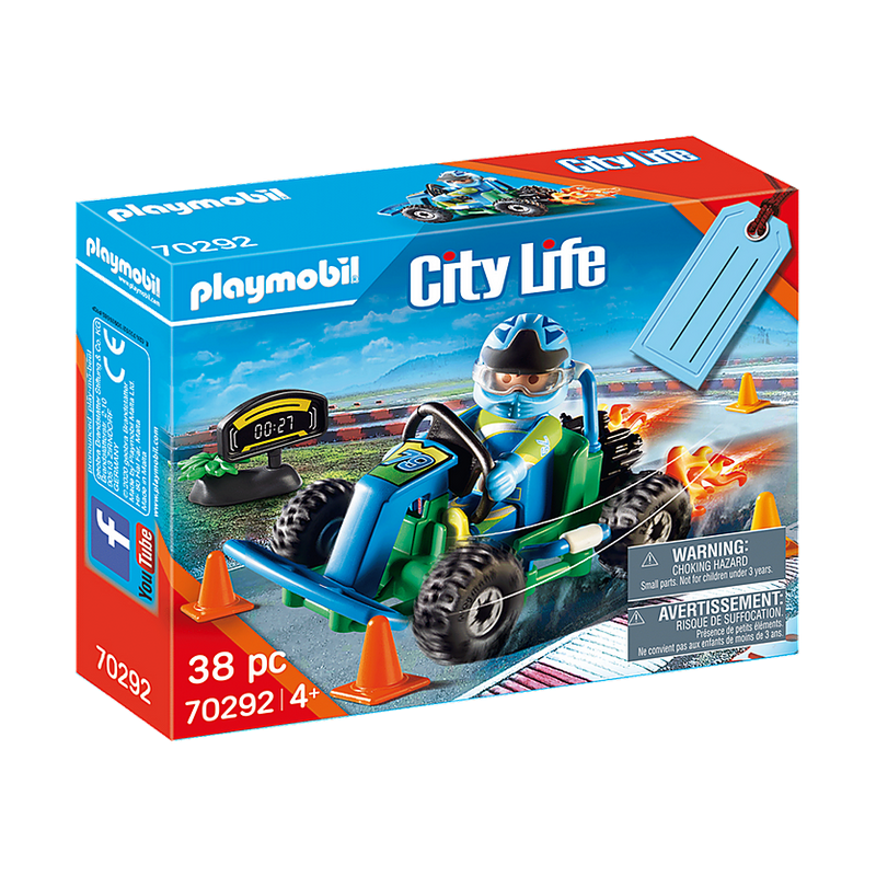 Le pilote dans son karting est prêt pour la course ! Attention, les feux vont bientôt passer au vert ! Le Set cadeau Pilote de Kart Playmobil 70292 est un coffret cadeau prêt à offrir avec une étiquette pour inscrire le nom du destinataire.