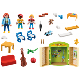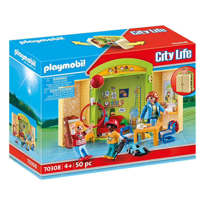Le coffre Garderie Playmobil City Life 70308 contient une maîtresse de maternelle, deux enfants, des jouets et du matériel pour les activités.