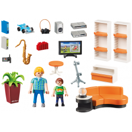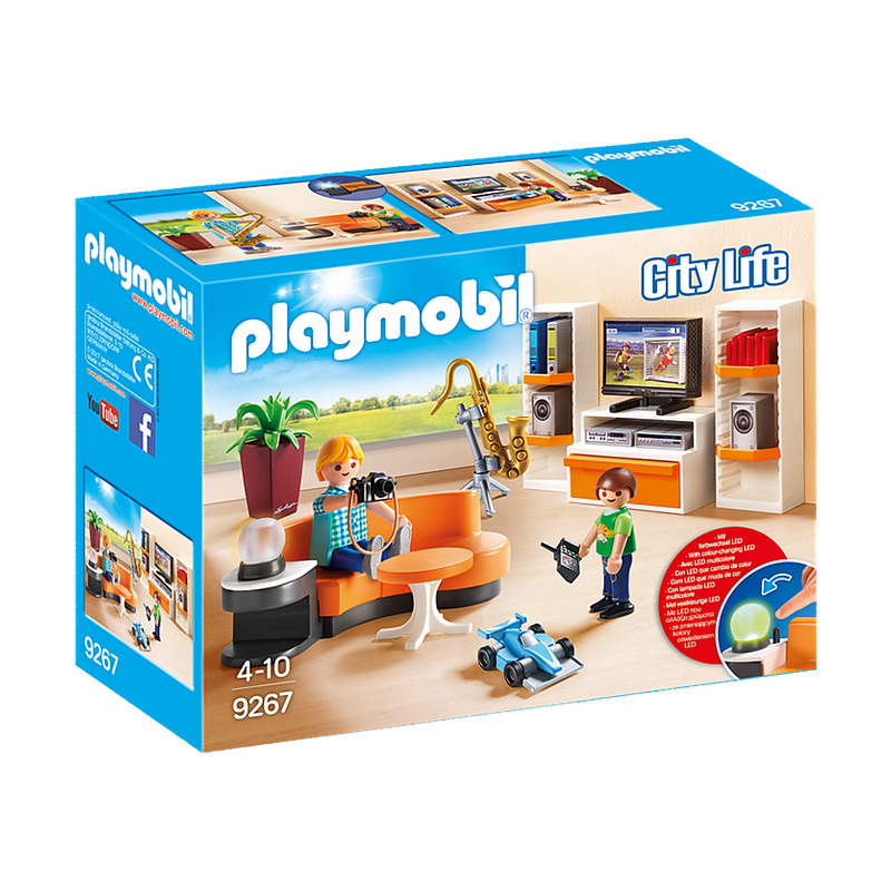 Le séjour peut être aménagé librement par vous, architectes d'intérieur en herbe. Où donc vais-je pouvoir placer le sofa, le buffet, l'écran plat ou le saxophone ? Tout est possible. Il ne reste qu'à installer la lampe... et si ça ne convient pas, il suffira de recommencer ! Chouette effet de lumière : la lampe peut s'allumer en blanc ou avec des effets lumineux (nécessite 2 piles 1,5 V micro non fournies). Contient deux personnages et des accessoires.