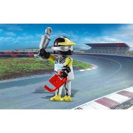 PLAYMO-FRIENDS : Agrandis ta collection ! Le pilote vient de remporter la course, il brandit fièrement son trophée ! Il repart aussi avec le volant de sa voiture de course.