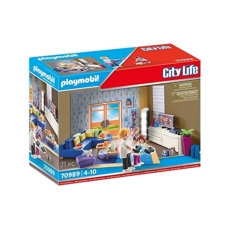 Meublé de façon moderne avec un canapé d'angle, une table basse, un meuble avec TV et de nombreux autres accessoires. La lampe diffuse une lumière agréable (nécessite 1 pile 1,5V AAA non fournie).