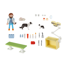 Une vétérinaire avec trois animaux (deux chiens et un chat) et le matériel pour les soigner. Avec une table d'opération et des bandages pour les animaux.
