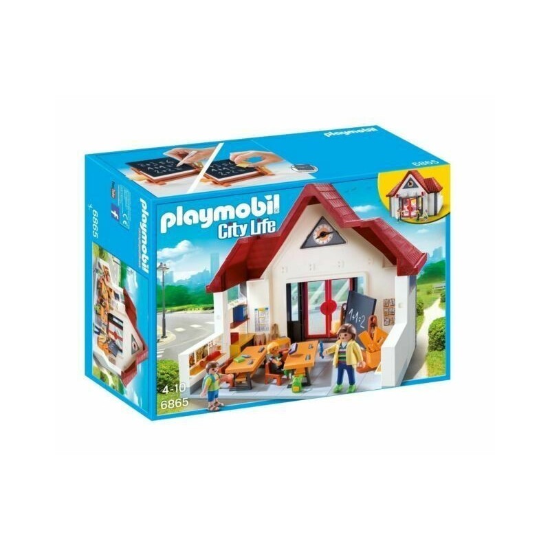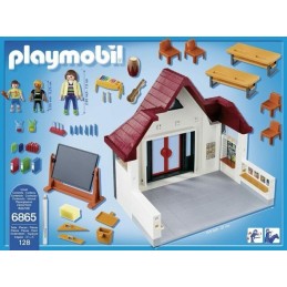 Contient: 3 personnages, 2 bureaux, 1 tableau noir, 1 grand crayon blanc, 2 sacs à dos et divers accessoires (crayons, classeurs, livres, guitare, xylophone). Les portes de l'école s'ouvrent. Tableau effaçable.
