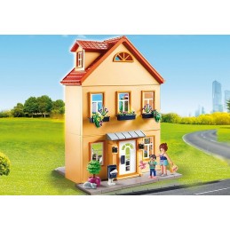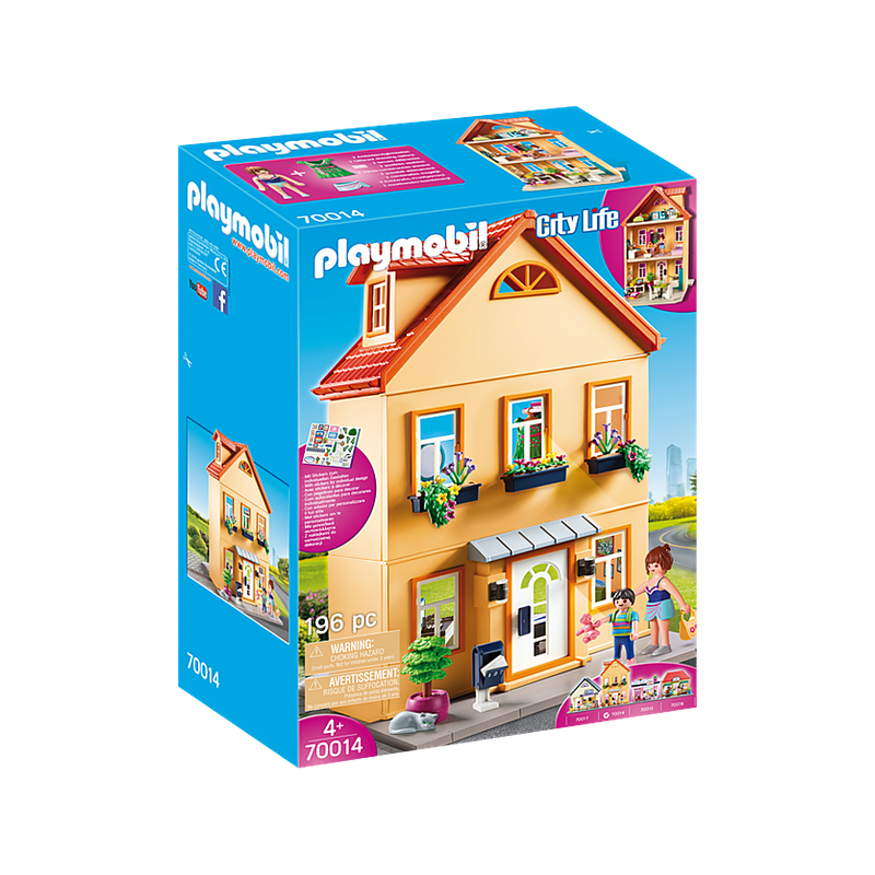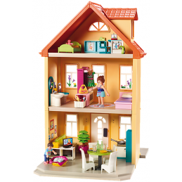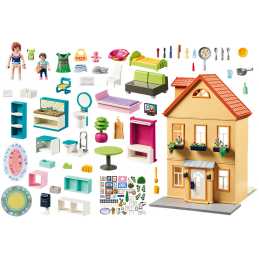 Accessoires: 1 maison de ville, 1 lavabo avec miroir, 1 toilette avec porte-papier toilette, 1 brosse de toilette, 1 table, 4 chaises, 1 kitchenette, 1 bureau pour enfants, 1 chaise haute, 1 lit, 1 lit bébé, 1 canapé-lit, 1 oreiller, 3 étagères différentes, 1 étagère cube, 1 étagère avec penderie, 2 tapis, 2 boîtes, 1 panier, 1 boîte aux lettres, 1 pile de lettres, 1 pot de fleur avec plante, 1 plat écran TV, 4 assiettes, 4 cuillères, 4 couteaux, 4 fourchettes, 1 poêle, 1 pot, 4 verres, 4 bouteilles, 1 sac à dos enfant, 1 sac à main, 1 livre, 1 bouquet de livres, 1 panier chat avec couverture, 1 robe (2 parties), 1 jupe (2 parties), 1 cintre, 1 montre-bracelet, 1 peigne, 1 brosse à dents, 1 tasse, 2 flacons cosmétiques, 1 rouge à lèvres, 1 pinceau poudre, 1 mascara, 1 poupée, 1 escargot jouet, 1 feuille d'autocollants avec des autocollants réutilisables