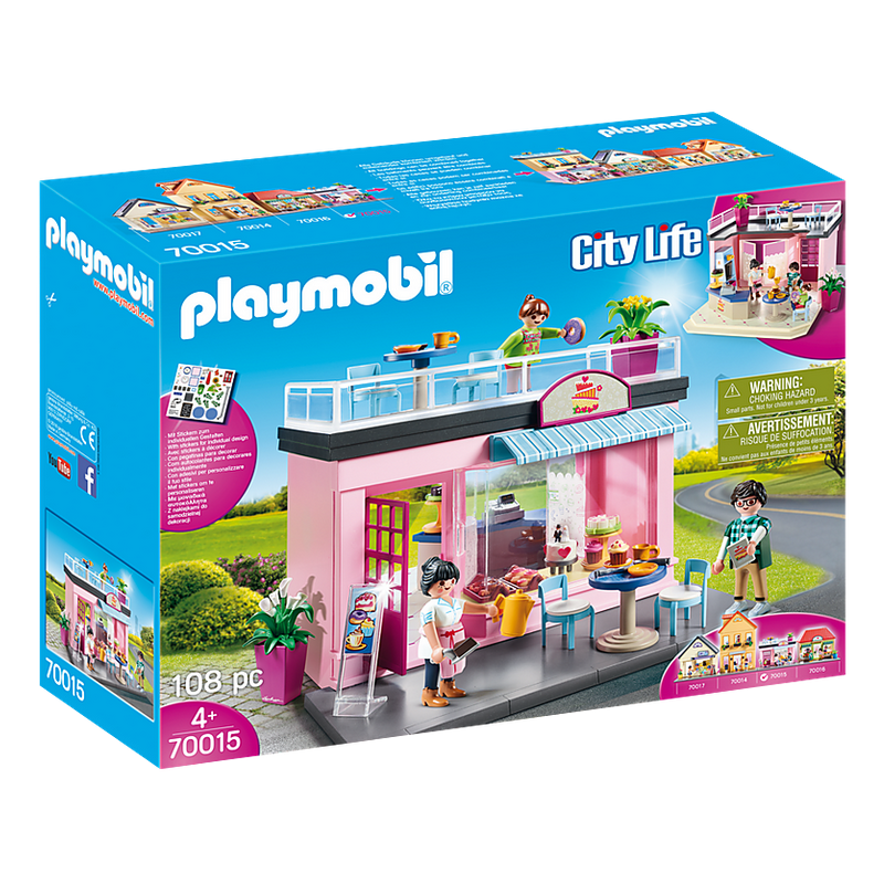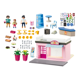 Accessoires: 1 café, 1 comptoir, 2 tables, 4 chaises, 1 étagère, 1 caisse enregistreuse, 1 machine à café, 1 gâteau de mariage, 2 gâteaux, 1 pelle à gâteau avec un morceau de gâteau, 2 plateaux avec pâtisseries, 2 beignets, 2 cupcakes, 2 étagères, 4 assiettes, 4 tasses, 1 pichet, 4 cuillères, 4 couteaux, 4 fourchettes, 1 tablier, 1 boîte, 2 cartes, 1 stand d'information, 2 pots de fleurs avec des plantes, 1 feuille d'autocollants avec des autocollants réutilisables