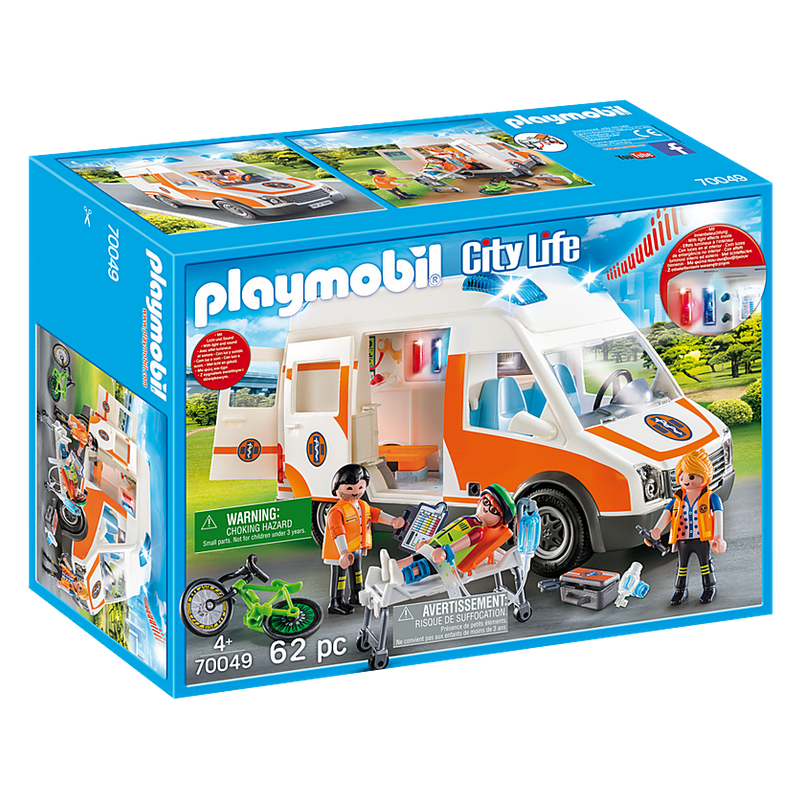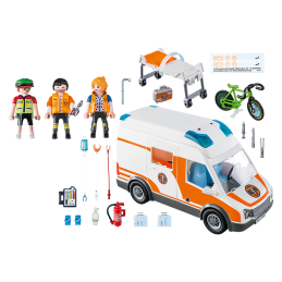 Accessoires: 1 ambulance avec lumière et son clignotants, 1 civière avec sangle de fixation, 1 mallette médicale, 1 support IV, 1 flacon IV avec tube, 1 sac de réanimation, 2 tubes, 2 pansements pour attelles, 1 fiche, 2 inserts pour moniteur, 1 extincteur, 1 jeu d'instruments chirurgicaux, 1 feuille d'étiquettes avec pansement, 1 vélo, 1 casque de vélo
