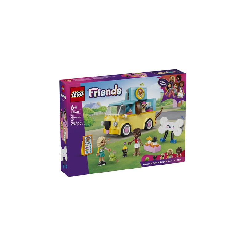 Les passionné.e.s d’animaux laissent libre cours à leur imagination avec le jeu de construction Le van d’accessoires pour animaux LEGO Friends (42678). Les enfants dès 6 ans peuvent charger le van, exposer les accessoires, organiser un défilé de mode pour animaux et créer des aventures amusantes. Ce kit inclut 2 mini-poupées, des animaux (chaton, chien et grenouille) et de jolis accessoires pour animaux. Parmi les détails amusants du set, le van carlin peut accueillir une mini-poupée et remue la queue lorsqu’il roule ! Exprimez votre créativité en aidant les animaux à faire leur choix : chapeau de pluie, de cowboy, haut-de-forme ou couronne de fleurs. Découvrez l'adorable mascotte os, puis chargez le van et en route pour de nouvelles aventures. Le jouet de construction LEGO est un cadeau amusant pour les filles et les garçons qui aiment les animaux et les chiens carlins. L’appli LEGO Builder propose une expérience de construction intuitive avec des outils pour zoomer, faire pivoter les maquettes en 3D, sauvegarder les sets et suivre sa progression.