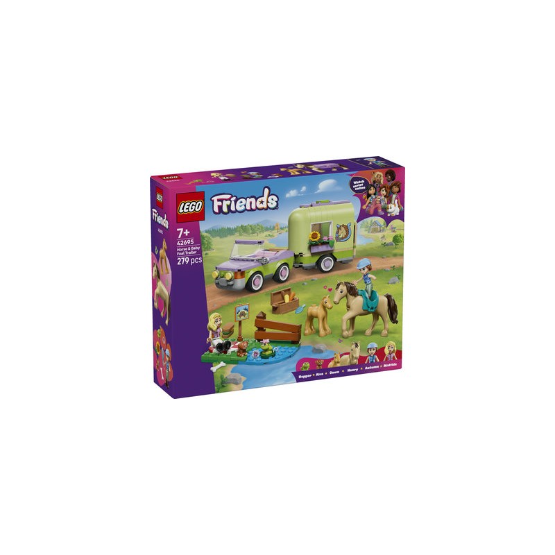 Le jeu de construction La remorque du cheval et du poulain LEGO Friends (42695) inspire aux enfants de 7 ans et plus une infinité de jeux créatifs mettant en scène des animaux. Le set inclut 2 mini-poupées, un cheval, un poulain, un chiot et une grenouille. Explorez tous les aspects des soins portés aux animaux grâce aux accessoires pour panser les chevaux, les transporter dans la remorque et leur faire sauter des obstacles. Les filles et les garçons peuvent imaginer de multiples histoires avec Autumn, Mathilde et leur voiture. Ouvrez la remorque et faites descendre le cheval et le poulain. Puis, sellez le cheval pour partir en balade. Un petit module annexe inclut une aire de pique-nique, un panneau, un lac et un obstacle à sauter. Ce kit de construction est un beau cadeau d’anniversaire pour les passionné.e.s de chevaux et de jeux avec des animaux. L’appli LEGO Builder propose une aventure de construction intuitive avec des outils pour visualiser les maquettes en 3D, sauvegarder les sets et suivre sa progression.
