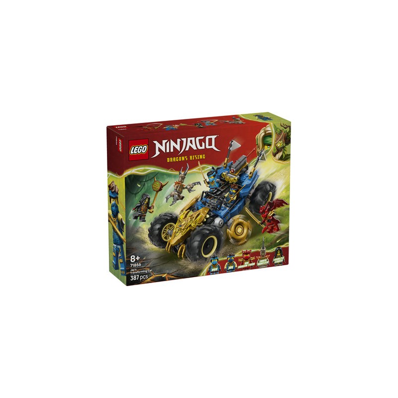 Hours of fast action awaits fans with the LEGO NINJAGO Jay’s Transforming Car toy for 8+ year old boys and girls (71856). This 2-in-1 ninja toy can be played with and displayed in 2 versions: regular mode or flipping the front to put it into dragon mode, revealing golden claws, a dragon head and rotating shurikens.