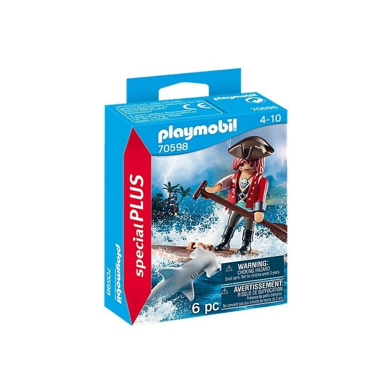 24 personnages Special Plus avec leurs accessoires pour de nouvelles histoires !Ce pirate dérive en mer, debout sur une porte en mauvais état. Mais un bébé requin tourne autour de l'embarcation de fortune… Ce n'est pas le moment de tomber !Contient un personnage.