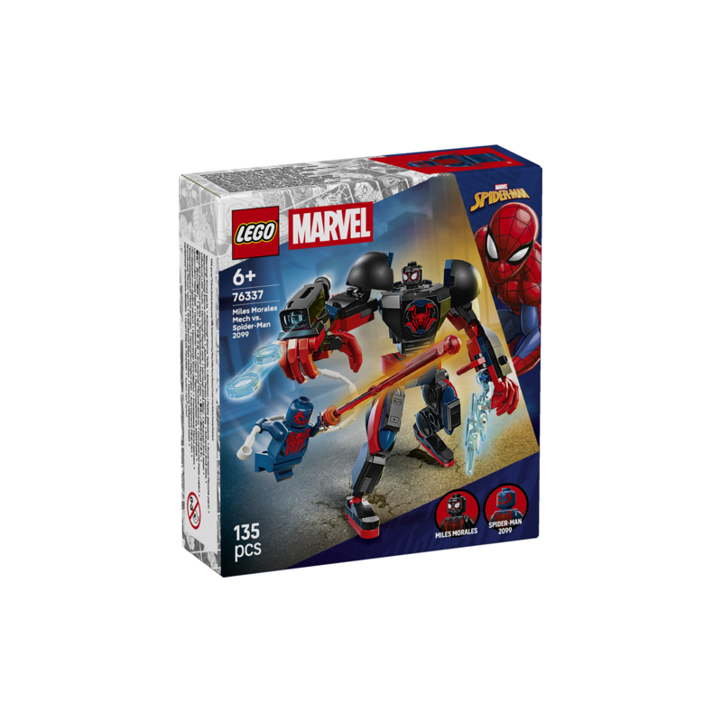 Bring supersized battle action from the Marvel movies to life with Miles Morales Mech vs. Spider-Man 2099 (76337), a Super Hero building toy gift for boys and girls ages 6 years old and up. This build-and-play kids’ toy will spark endless role play with a large, fully jointed mech, plus Spider-Man and Miles Morales minifigures. This LEGO® ǀ Marvel merchandise puts action from Marvel Studios’ Spider-Man: Across the Spider-Verse into kids’ hands with a highly posable mech that’s designed for dynamic play. On the mech’s arms are a detachable 3-stud shooter, web rope and razor web power blasts, ensuring non-stop battle action. The Spider-Man 2099 minifigure fights back with a hand-held laser beam. This set makes a great birthday gift idea for young Super Heroes, Marvel movie fans and collectors of Spider-Man merch. And, with the LEGO Builder app, kids can build with confidence – zoom, rotate in 3D and track progress with easy-to-follow digital instructions. Building set contains 135 pieces.