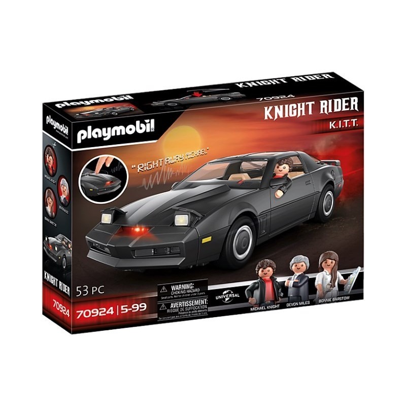 Les exploits d'un chevalier solitaire dans un monde dangereux. Le chevalier et sa monture ! Un héros des temps modernes, dernier recours des innocents, des sans-espoir, victimes d'un monde cruel et impitoyable.' Un détective que l'on croyait mort et qui a changé d'identité. Il est guidé par la justice et entreprend de s'attaquer au crime avec l'aide de K.I.T.T., une voiture futuriste dotée d'une intelligence artificielle et équipée de gadgets et d'armes high-tech. Aujourd'hui, K.I.T.T., la légendaire voiture de la série à succès K2000, fait son entrée dans la gamme des véhicules PLAYMOBIL. Playmobil K.I.T.T. est équipé de tous les gadgets authentiques comme une imprimante sous le tableau de bord, une plaque d'immatriculation rotative, un cordon avec un grappin, des phares escamotables ou bien encore le toit amovible. K.I.T.T. est doté d'effets sonores et lumineux activables par pression sur le capot. Le véhicule cite des répliques de la série avec la voix originale de K.I.T.T.. Des citations spécifiques sont associées à la fonction marche/arrêt, les autres étant diffusées de manière aléatoire. Dans le même temps, avec une pression sur le capot, l'icône du scanner à l'avant du véhicule s'allume et la lumière du tableau de bord clignote. En plus du personnage principal Michael Knight, le set de jeu contient des accessoires très détaillés tels que le laboratoire informatique de Bonnie Barstow et le mobilier de bureau de Devon Miles. Maintenant, on embarque pour la prochaine mission !
